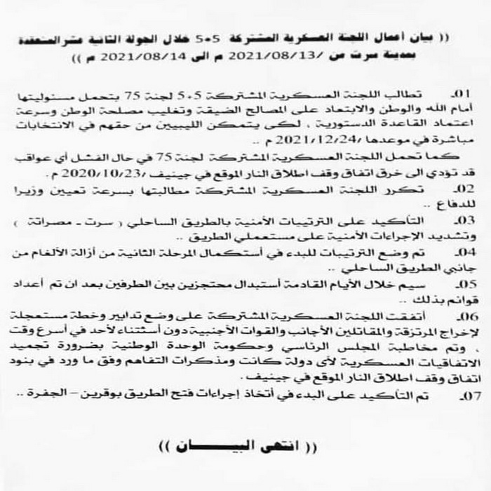 وذكرت اللجنة في بيانها أنها اتفقت على وضع تدابير وخطة مستعجلة لإخراج القوات الأجنبية والمرتزقة من ليبيا دون استثناء بأسرع وقت.
