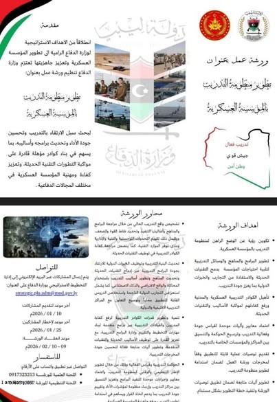 إنطلاقًا من الأهداف الاستراتيجية لوزارة الدفاع بحكومة الوحدة الوطنية الرامية إلى تطوير المؤسسة العسكرية وتعزيز جاهزيتها؛ تعتزم وزارة الدفاع تنظيم ورشة عمل بعنوان : تطوير منظومة التدريب بالمؤسسة العسكرية وذلك من أجل بحث سبل الإرتقاء بالتدريب